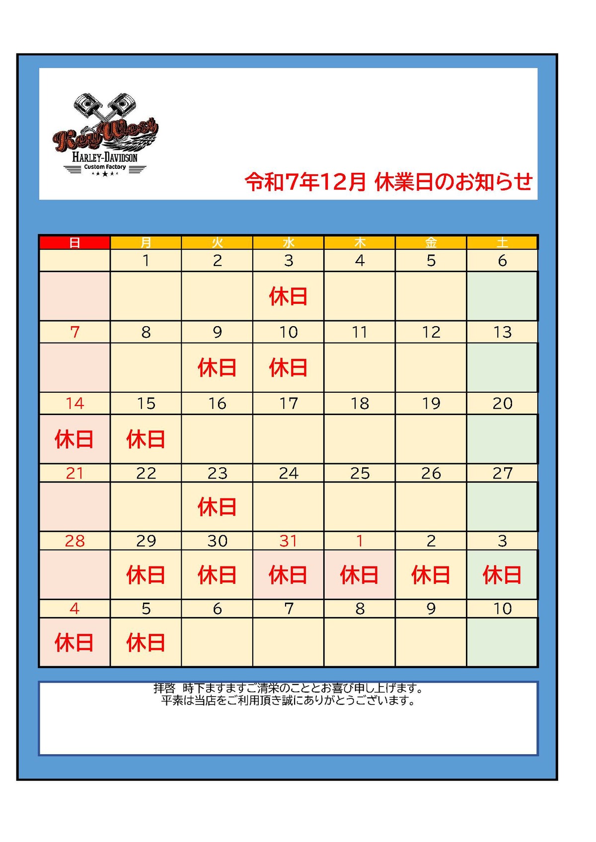 12月及び年末年始の営業カレンダーです。