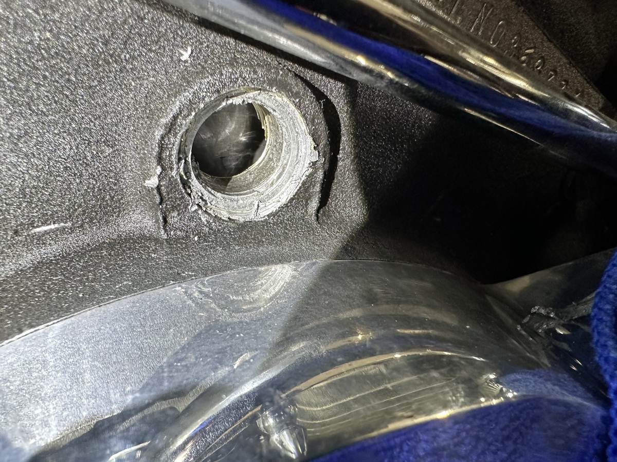 上死点出すのに点検用プラグ外したら、、、No~!なんじゃこりゃ?ねじ山無し、コーキング止め。。マジか。。。